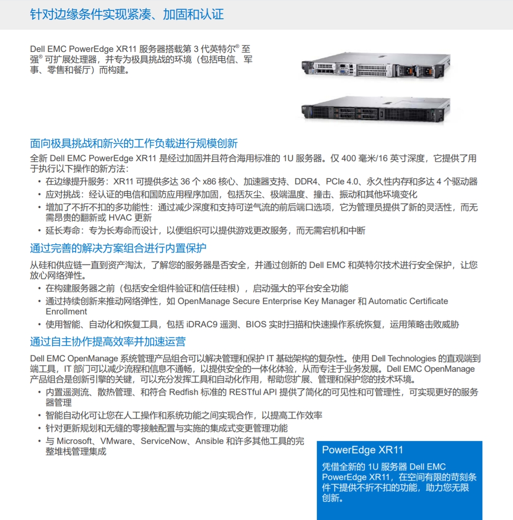 Dell EMC PowerEdge XR11 服務(wù)器專為極具挑戰(zhàn)的環(huán)境(包括電信、軍事、零售和餐廳)而構(gòu)建。