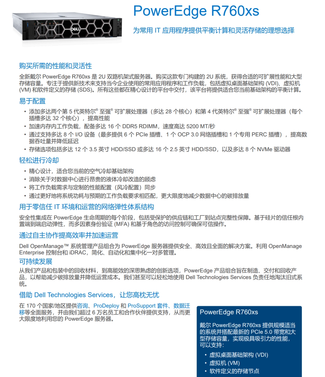 全新戴爾 PowerEdge R760xs 是 2U 雙路機架式服務器,專注于提供新技術來支持當今企業使用的常用應用程序和工作負載,包括虛擬桌面基礎架構 (VDI)、虛擬機(VM)和軟件定義的存儲 (SDS)。所有這些都在精心設計的平臺中交付,該平臺將提供適合您當前基礎架構的平衡計算