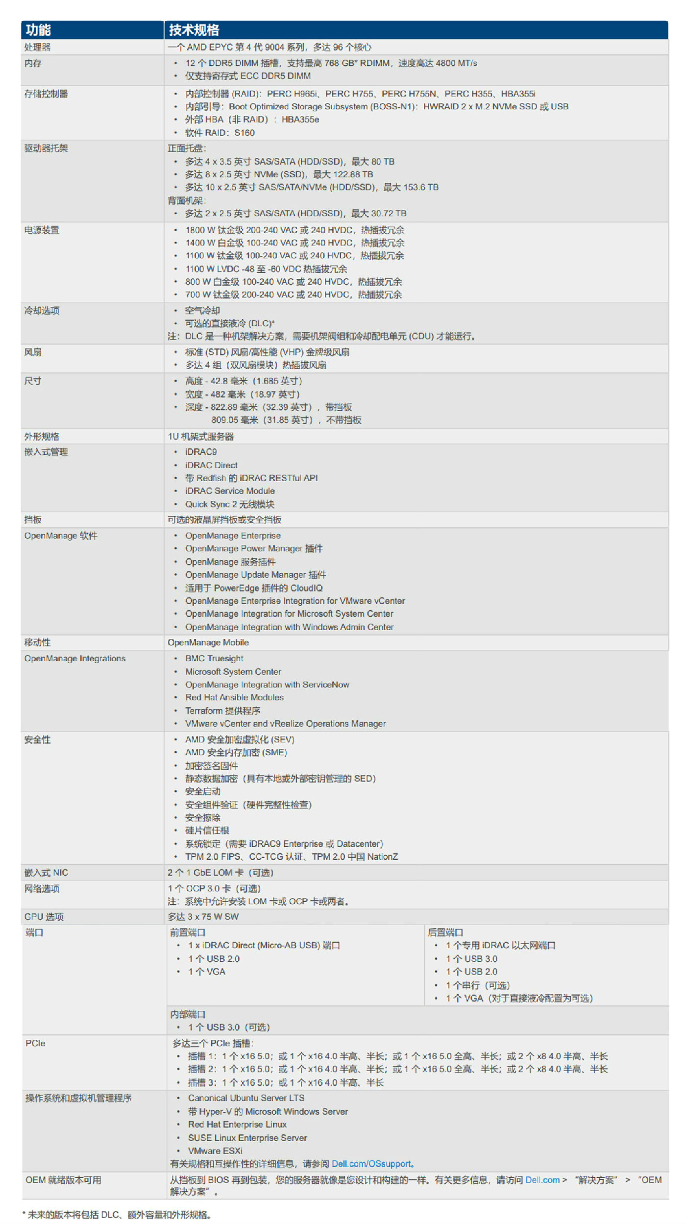 全新戴爾 PowerEdge R6615 是 1U 單路機(jī)架式服務(wù)器。這款服務(wù)器旨在為您的數(shù)據(jù)中心提供出色的每美元投資,可在空氣冷卻或直接液冷 (DLC)* 配置中提供高性能、靈活性、低延遲的存儲選項。