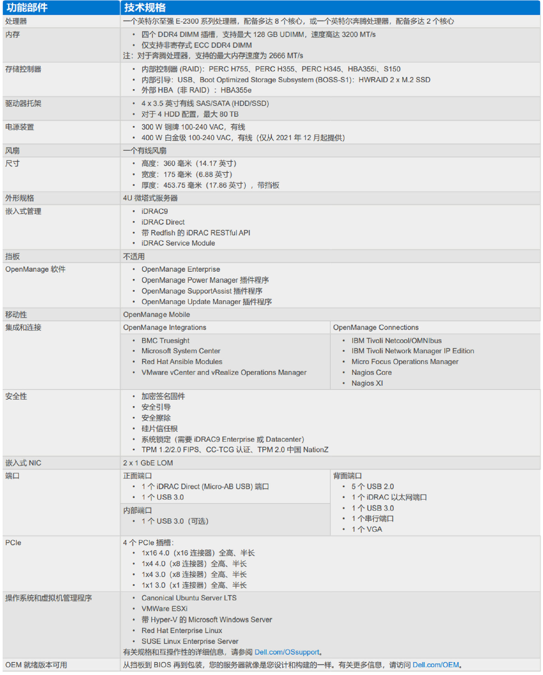 PowerEdge T150 采用英特爾? 至強? E-2300 處理器,是一款入門級塔式服務器,在適應性與經濟實惠性之間實現了出色平衡,可滿足不斷變化的計算需求。1.支持 3200 MT/s DDR4 UDIMM,高達 128 GB2.支持 PCIe 4.0,實現了顯著的吞吐量提升3.非常適合文件/打印、郵件/消息傳送、銷售點、Web 托管和協作4.提高了散熱效率5.借助 UEFI 安全啟動提高了安全性,縮短了啟動時間