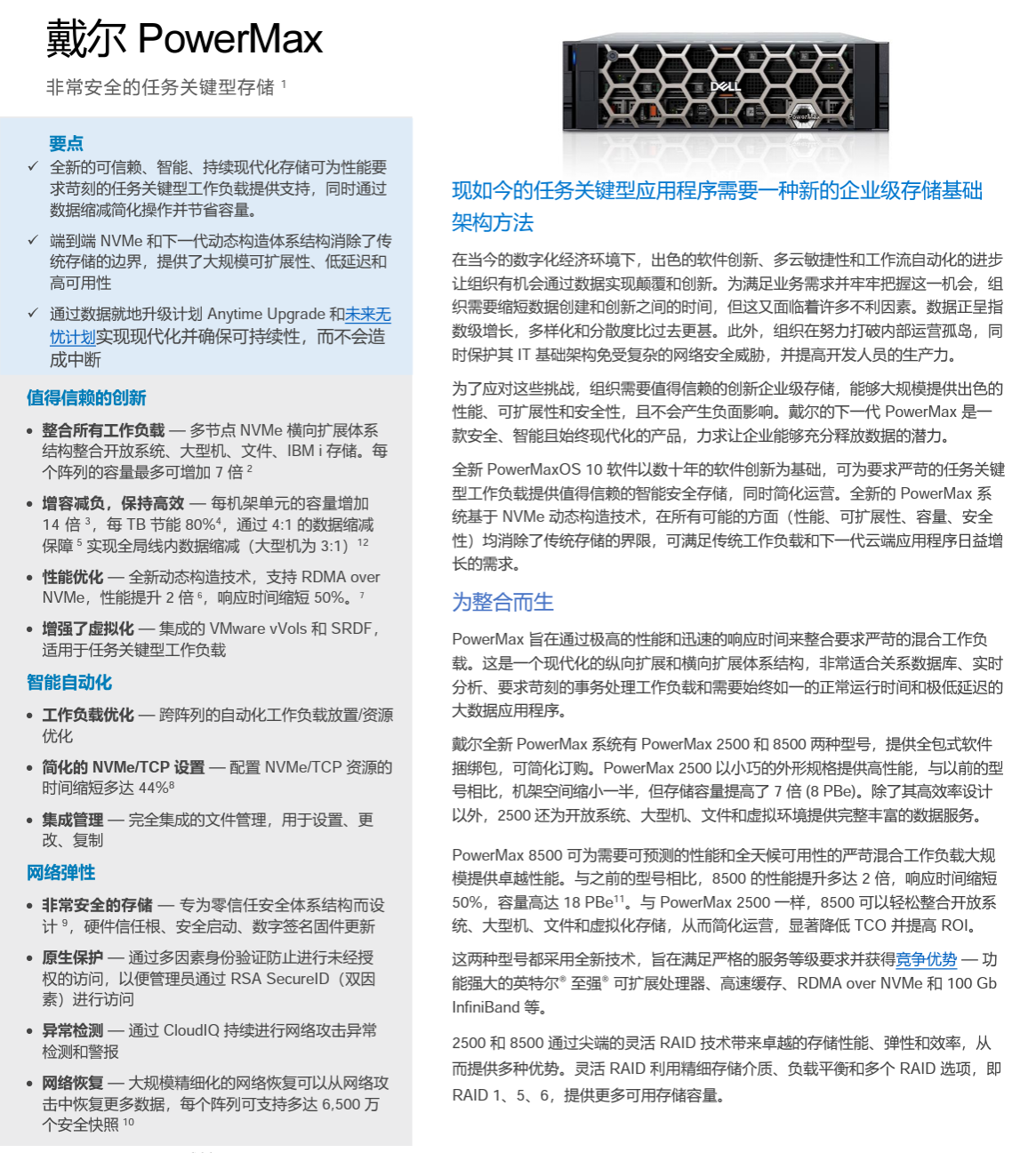 高度安全、極具動(dòng)態(tài)性的全自動(dòng)化 PowerMax,助您做好萬(wàn)全的準(zhǔn)備。憑借智能自動(dòng)化和大規(guī)模條件下依然卓越的性能,靈活應(yīng)變,輕松滿足不同需求。借助這款軟件驅(qū)動(dòng)型存儲(chǔ)解決方案,貴組織可以節(jié)省時(shí)間和資源,同時(shí)讓您有充足的機(jī)會(huì),為下一步發(fā)展做好準(zhǔn)備。