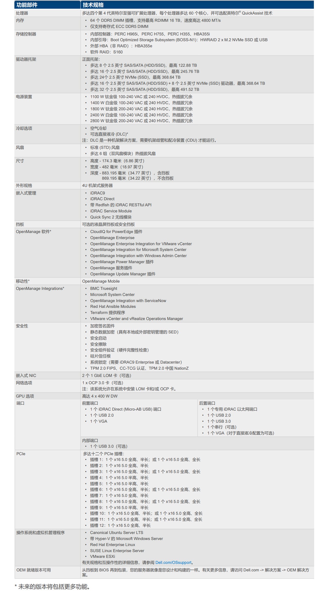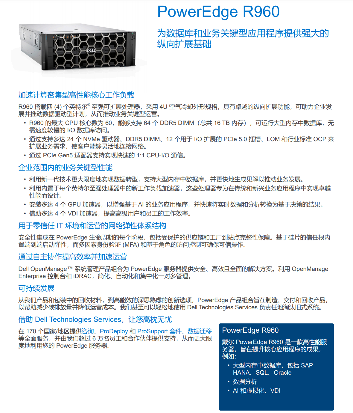 R960 搭載四 (4) 個英特爾? 至強可擴展處理器,采用 4U 空氣冷卻外形規(guī)格,具有卓越的縱向擴展功能,可助力企業(yè)發(fā)展并推動數(shù)據(jù)驅(qū)動型計劃,從而推動業(yè)務(wù)關(guān)鍵型運營。