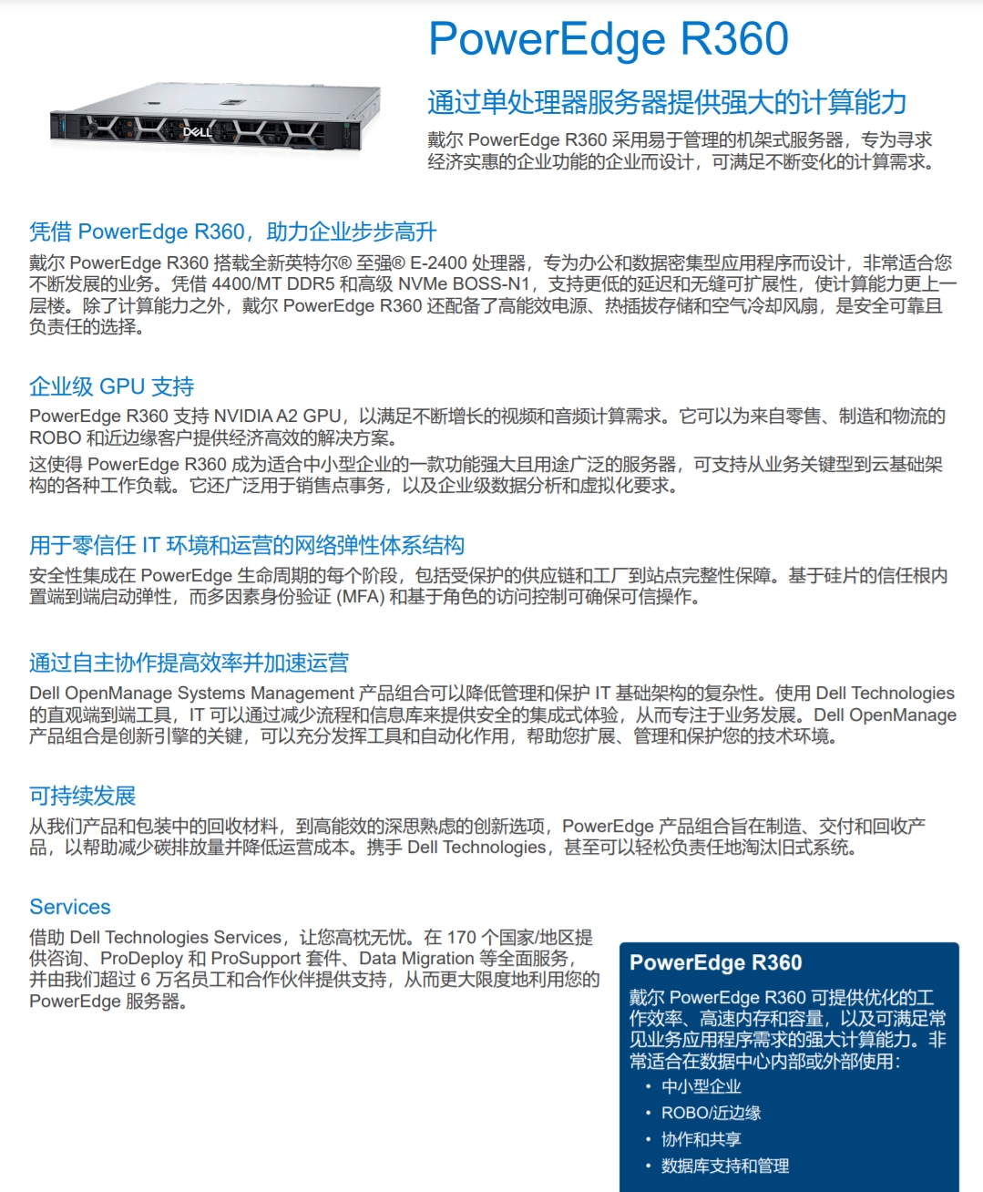 戴爾 PowerEdge R360 采用易于管理的機架式服務器,專為尋求經濟實惠的企業功能的企業而設計,可滿足不斷變化的計算需求。